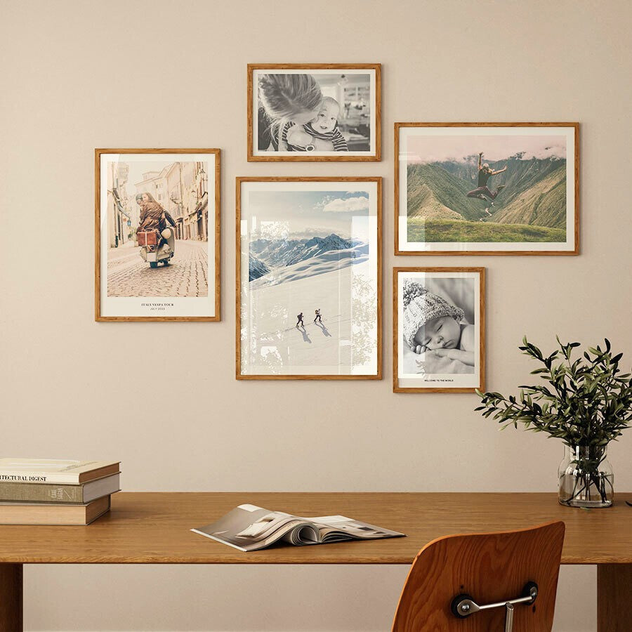 Utilizamos marcos de madera solida cortados con precisión por maquina para la creación de nuestros marcos. Actualmente están disponibles en diferentes acabados de madera, como negro, blanco y madera clara. Además, los marcos tienen caimanes de metal para colgarlos fácilmente.